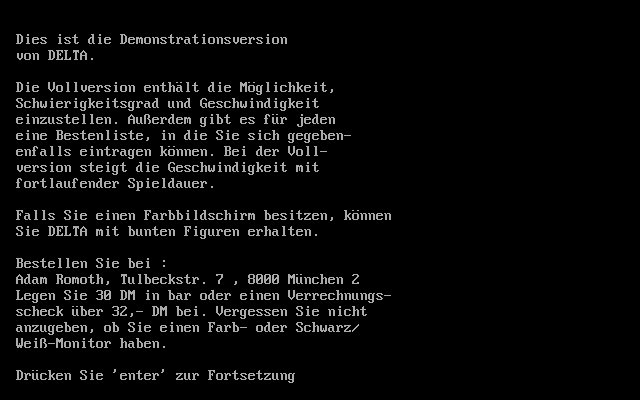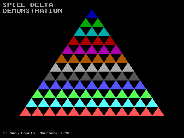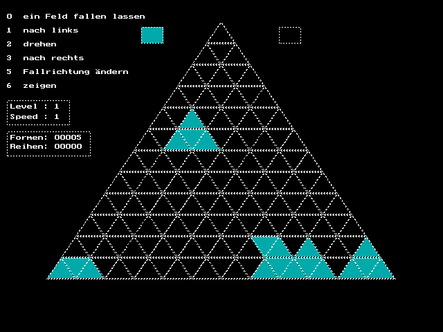Игровое поле Delta - равносторонний треугольник, разделённый на более мелкие фигуры такого же вида. Вместо тетрамино - блоки причудливой формы, состоящие из трёх, четырёх и пяти треугольников. Сперва может показаться, что они составлены хаотично, но на самом деле их формы как раз такие, чтобы они могли наиболее компактно стыковаться с уже лежащими в "стакане". Управление назначено на цифры, причём работают как стандартный их ряд, так и Num-клавиатура. 1 и 3 - перемещение фигур влево и вправо, 2 - поворот, 0 - быстрое опускание, 5 - регулятор направления падения (влево или вправо), 6 - включение и выключение окошка со следующей фигурой.