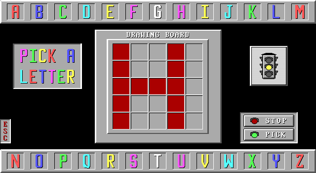 Первая забава называется «Learning Your ABC’s». Самый верхний здешний пункт, «Learn», запускает такую себе анимированную сценку на тему знакомства с буквами английского алфавита: первым делом юному пользователю предлагается... поупражняться в чём-то вроде караоке – «спеть» всю азбуку под аккомпанемент PC Speaker’а, следуя поочерёдно подсвечивающимся на экране литерам от A до Z. Вслед за этим можно полюбоваться на то, как на экране по нажатию кнопки появляются один за другим кубики с изображением всё тех же букв. Второе блюдо здешнего меню, «Draw», также практически лишено интерактивности: выбираемые в произвольном порядке из верхнего и нижнего рядов литеры будут живописаться во всех подробностях в расположенной по центру сетке размером 5х5 ячеек: вероятно, таким образом действительно можно изучить основы их начертания. Но, конечно же, самое интересное начинается при нажатии кнопки «Game»: здесь необходимо проверить и закрепить полученные ранее знания, выбирая всё те же буквы в порядке строгой очерёдности из двух верхних рядов, где они расположены все вперемешку (т. е. начала следует найти и щёлкнуть на «A», потом на «B» – и так далее). Физиономия клоуна по центру экрана, своей мимикой реагирующая на наши успехи и неудачи, дополняет привычную систему звуковой индикации правильных и неправильных действий.