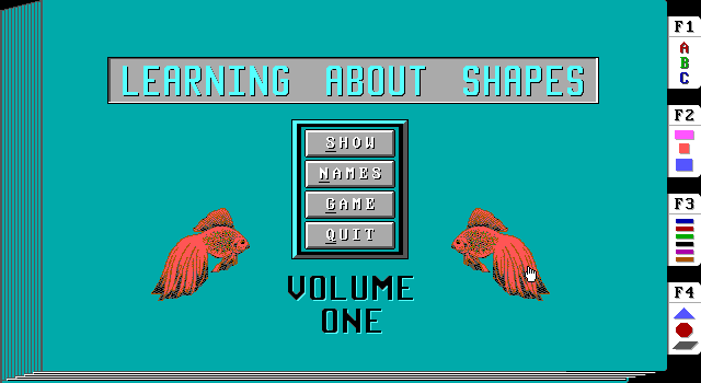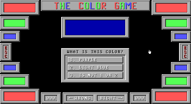 Оставшиеся две забавы, «Learning About Colors» и «Learning About Shapes», в принципе, во многом подобны предыдущей: пункты локального меню здесь носят те же наименования, и «Show» всё так же выводит на экран целое множество соответствующих объектов, тогда как «Names» позволяет выучить названия каждого из них в отдельности. Самое примечательное – конечно же, опять-таки «Game». В «цветном» режиме развлечение заключается в необходимости опознавать демонстрируемые один за другим цвета – выбираемые, разумеется, из общего ассортимента EGA-палитры в количестве пятнадцати штук: вверху красуется прямоугольник того или иного оттенка, а ниже расположены три варианта ответа. При этом третий из них всегда звучит как «Is Not 1 or 2» – и, пожалуй, оказывается правильным едва ли не в большинстве случаев. Ну а в мини-игре подраздела «Shapes» необходимо указывать поименованную текстом фигуру (треугольник, овал, трапецоид и др. – всего девять форм, причём без уже изученных ранее квадратов и прямоугольников), выбрав одно из демонстрирующихся на экране четырёх изображений (таковые для удобства идентификации подписаны буквами A, B, C и D).