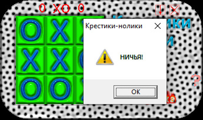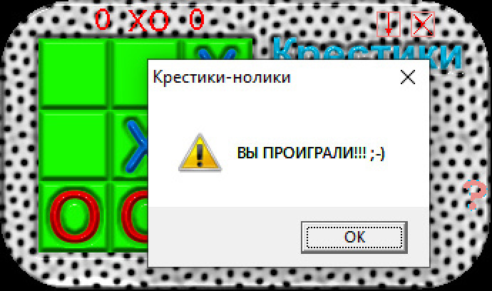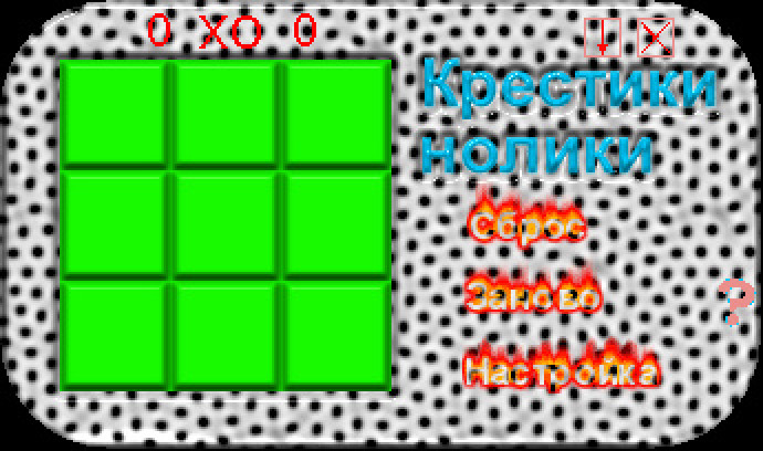 Очередная реализация "крестиков-ноликов" для Windows, добытая со сборников в духе "n игр на русском языке". Что здесь интересного? Окошко в форме прямоугольника с закруглёнными углами, "пятнистый" фон, нолики и крестики с имитацией объёма, - всё выглядит откровенно по-любительски, но куда лучше многих подобных поделок. В настройках можно указать, кто ходит первым, а также выбрать, на чьей стороне играть. Искусственный интеллект вроде бы неплох, но иногда ошибается, так что соперничать с ним может быть интересно.