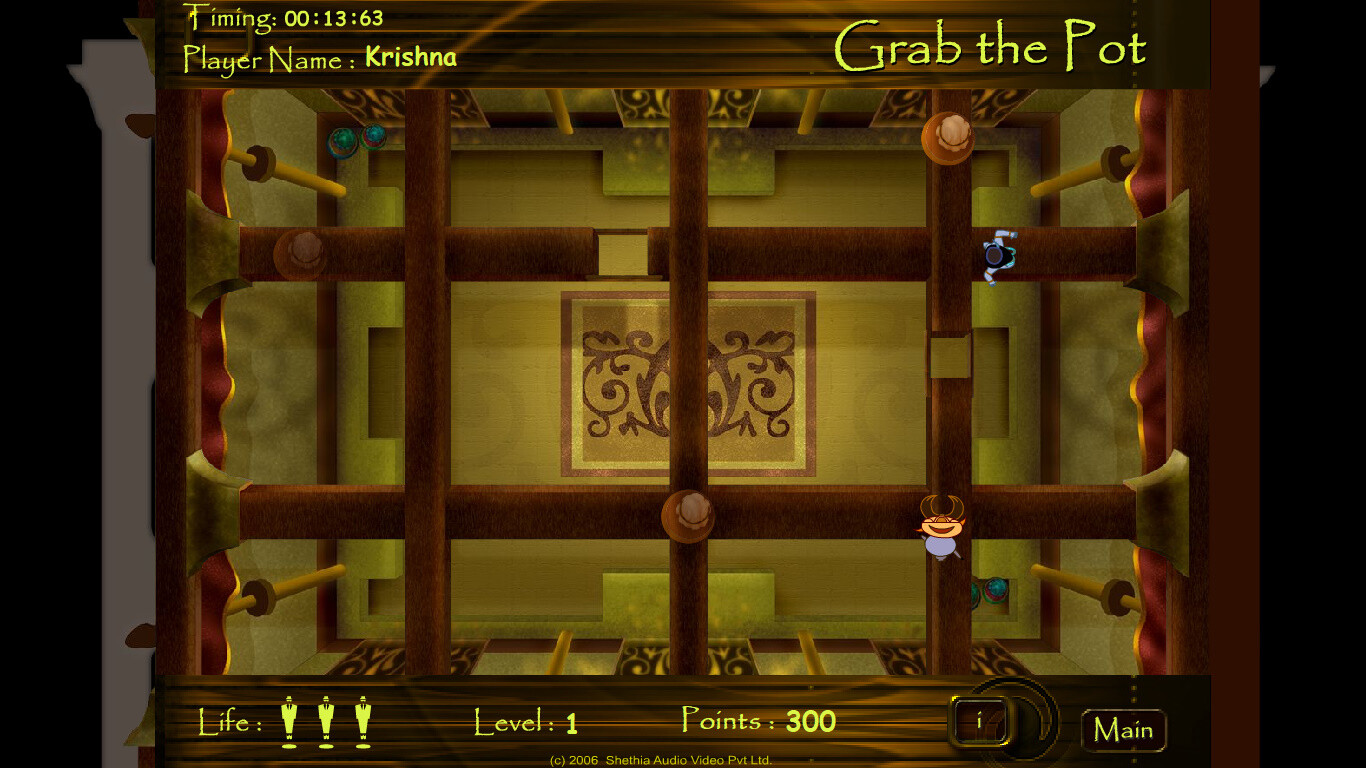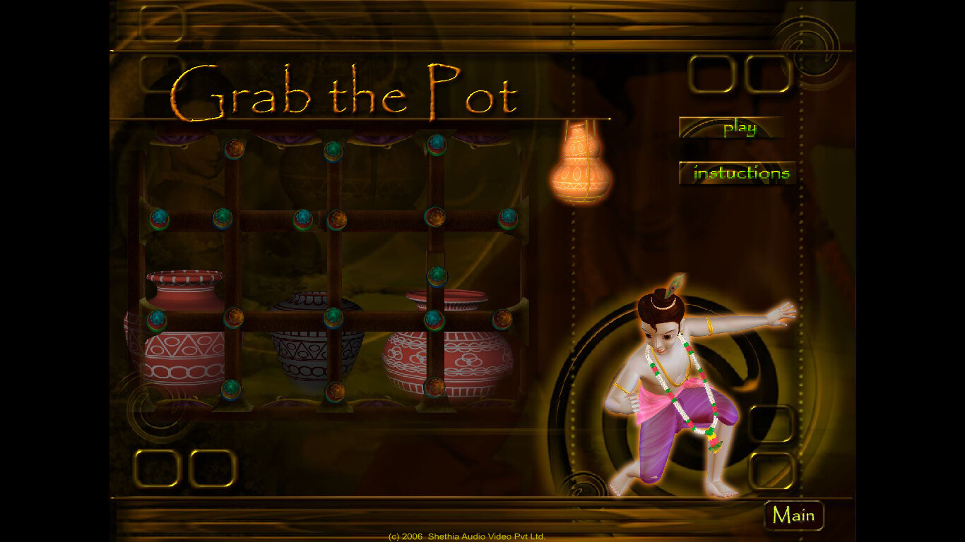 3. Grab the Pot. Водя Кришну по четырём перекрещивающимся рейкам, нужно собирать горшки с маслом. Игра состоит из трёх уровней с видом сверху, проходящих на одной и той же одноэкранной локации. Главному герою мешают жуки, которые появляются на рейках с одного края и входят в другой; контакт с ними отнимает одну из трёх жизней. На первом уровне жуков два, на втором - три, и все они не особенно мешают, лишь изредка заставляя выжидать. На третьем же появляется красный жук, преследующий игрока. Он всегда выбирает кратчайший путь, что нужно пытаться использовать в своих целях и заставлять его менять направление движения. Учитывая архитектуру уровня (решётка для игры в "крестики-нолики"), спрятаться особо негде. Ситуация усложняется наличием на рейках двух дыр, попадание в которые смертельно, а Кришна, несмотря на божественное происхождение, прыгать здесь не умеет. Жуки же свободно минуют их. Для прохождения уровня нужно набрать определённое число очков, однако не все горшки их приносят - некоторые оказываются пустыми, что нельзя определить по их внешнему виду. Одновременно на экране может присутствовать не более трёх горшков, а будучи некоторое время несобранными, они исчезают и появляются в другом месте, так что не стоит удивляться тому, что пока Кришна стоял и ждал, когда пройдёт жук, объект его сбора оказался совсем не там, где был до этого.