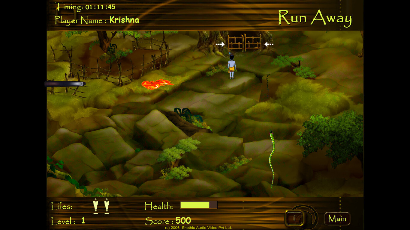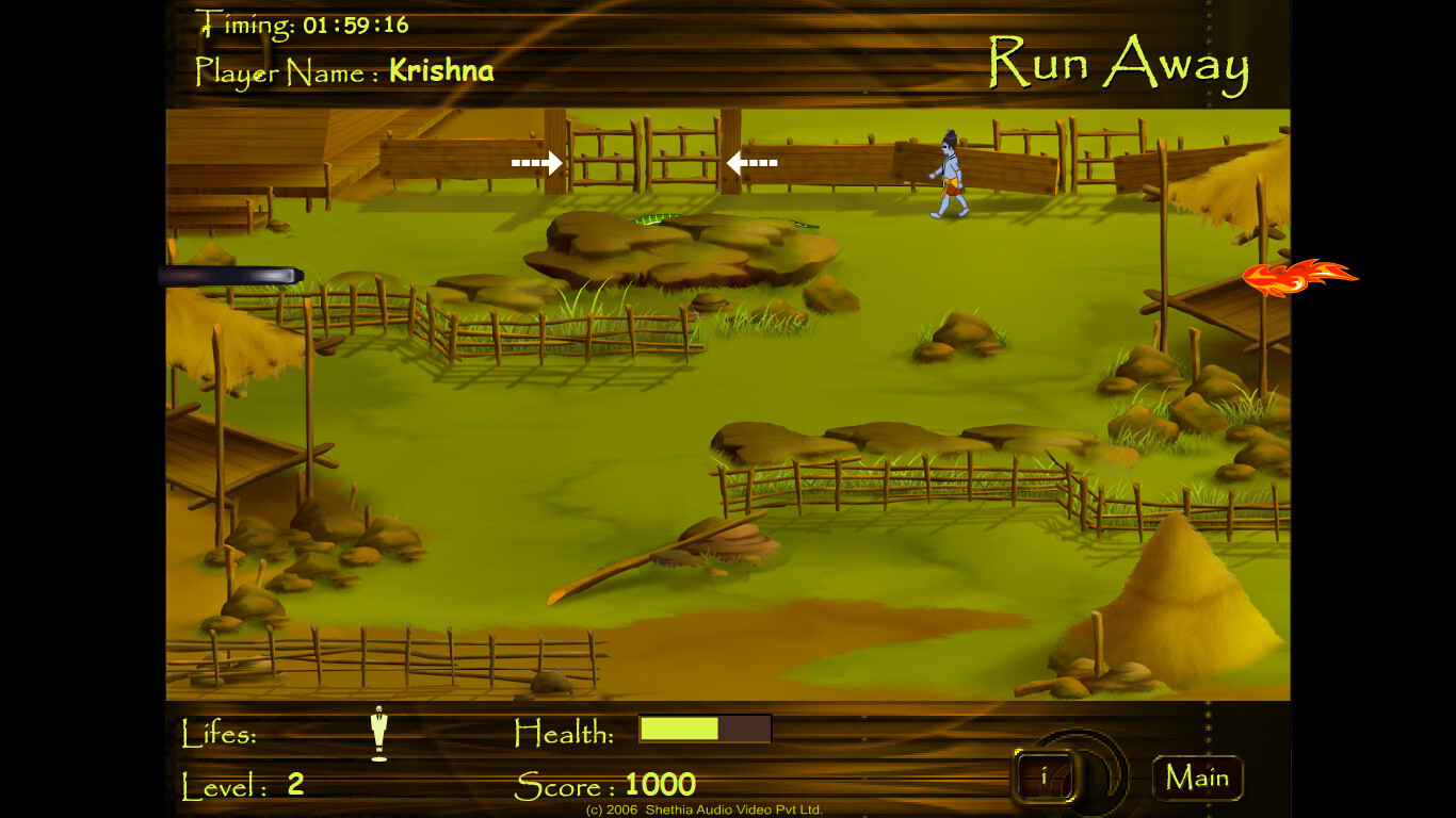 4. Run Away. Довольно странная аркада с видом сверху. Управляя вновь Кришной, ходим по открытой местности, ограниченной одним экраном, и собираем некие мешочки. Как только нужное количество собрано, появляется ключ, который нужно взять, а затем пройти к двери на следующий уровень, которых всего три (и на этот раз локации разные). Процесс усложняется наличием не всегда очевидных барьеров в виде рельефа, заборов, камней и деревьев, а также из-за врагов - по экрану проползают змеи, а с краёв в Кришну стреляют огненными сгустками. Жизней всего три, но каждая содержит довольно большой запас здоровья.