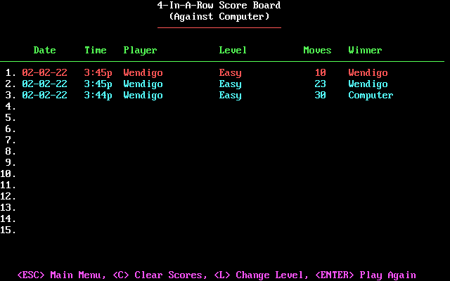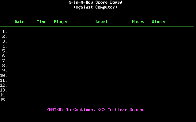 Ничего особенно в 4-In-A-Row не наблюдается. Графика стандартна для "Четыре в ряд" и лишена дополнительных украшений, управление осуществляется с помощью клавиатуры. Присутствует таблица рекордов, в которой фиксируются результаты партий с сортировкой по количеству ходов - чем меньше, тем лучше. Последний момент интересен, так что если вы хотите сохранить данные о проведённых играх, то рекомендуем выбрать этот вариант.