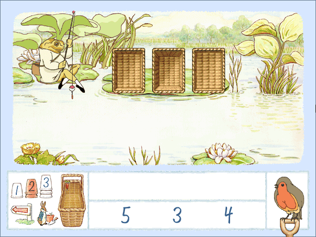 В третьей мини-игре, Sorting, надобно подсобить мистеру Мак-Квакилу (тоже предлагаем определить по его имени, к какому животному царству сей муж относится). Скоро к данному товарищу придут гости-привереды, а закусить нечем. Так что наш лягуш отправляется на ближайший пруд наловить рыбы. Здешние задачки бывают двух типов: определение общего внешнего признака у проплывающих под водой рыбёшек и вылавливание оных с последующей сортировкой по корзинам на основе некоего критерия (размер, цвет, число пятен). Ничего сложного. Когда рыбка клюёт, то мы кликаем по ней, после чего выбираем той же мышью правильную корзину. Если ошиблись, то Мак-Квакил отпускает «малька» на волю. Наловив нужное количество, вываливаем улов на всеобщее обозрение, после чего решаем или составляем простенькое (не)равенство, расставляя те или иные математические знаки.