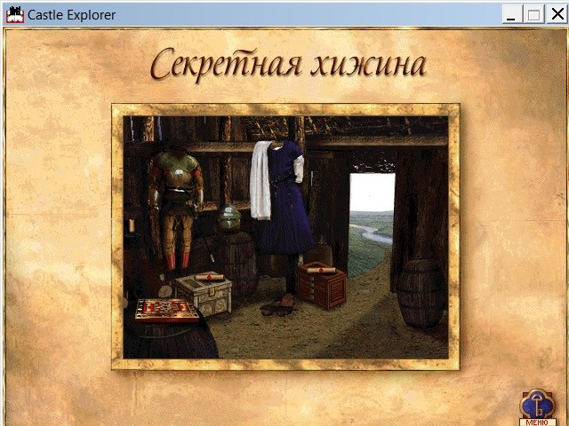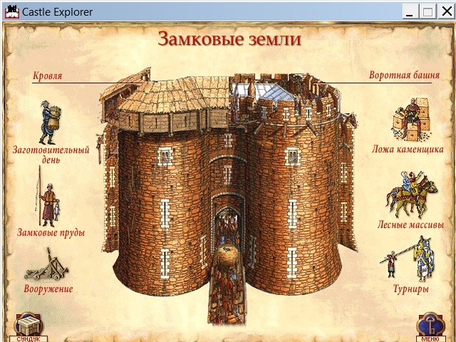 В отличие от исторических приключений французской школы, британское куда более серьёзно и на первый план ставит именно образовательный элемент: «Castle Explorer» – не столько адвенчура со встроенной энциклопедией, сколько интерактивная виртуальная диорама с обилием познавательной справочной информации и комплектной игрой (хотя эпитет «мини» к этой последней применить никак не удастся). Главное меню, в котором мы оказываемся после запуска и краткого вступительного ролика, именуется здесь «Castle Guide» (или «Путеводитель»): по центру отображается вид на замок с высоты птичьего полёта, а по бокам – десять наименований отдельных частей этого комплекса, открытых для подробного изучения (воротная башня и помещения гарнизона, ближайшие окрестные земли и банкетный зал, нижний, средний и верхний дворы и т. д.). В принципе, ничто не мешает посетителю остаться в роли того самого пажа и просто «гулять» по этим достопримечательностям в своё удовольствие, осматривая интерактивные иллюстрации «в разрезе» вкупе с познавательными текстовыми к ним комментариями, – однако для полноценной игры необходимо, как нам и советуют во вступительном ролике, предварительно заглянуть в одно из сооружений, доступных не из пунктов меню по бокам, а по щелчку на его изображение на схеме по центру, – в «секретную хижину».