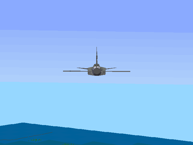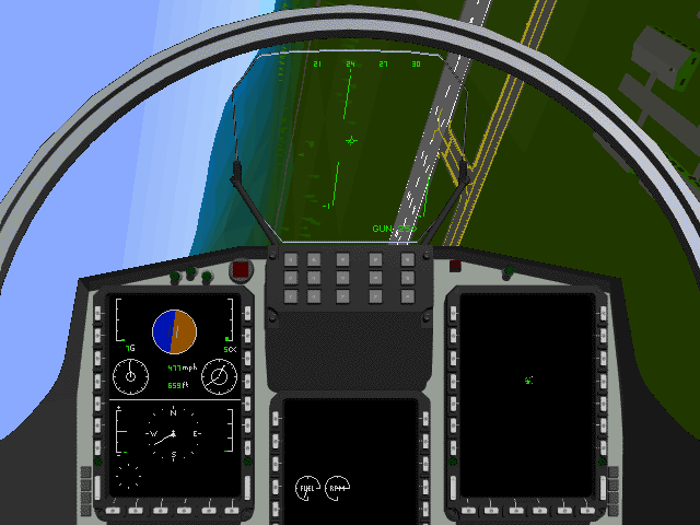 Ну а что у нас с симуляцией-то? В принципе, для отменённой игры многое присутствует и работает: указатели значений скорости (в mph) и высоты (в футах), обороты двигателя (в rpm), остаток топлива, индикаторы угла атаки и ускорения, навигационный прибор (курс), индикатор выпуска шасси. Циферки, правда, совсем мелкие, поскольку для подписей использован минимальный из возможных растровый шрифт 3х5. Приборные панели и МФД явно недоделаны – слишком много свободного места осталось. Самолёт довольно реалистично реагирует на управление по крену и тангажу. При разбеге по ВПП смоделировано подпрыгивание на неровностях. Кстати, самолёт как раз и был спроектирован для эксплуатации даже в условиях плохо подготовленных аэродромов с укороченной взлётной полосой. Интересно реализован эффект от положительной перегрузки – в два этапа: сперва игровая палитра становится бесцветной, а затем вообще мгновенно гаснет экран. Так что если будете выполнять крутой разворот на большой скорости, не пугайтесь – это не ошибка; просто дайте обратно рукоятку «от себя» – и изображение снова появится. При отрицательной перегрузке экран немного розовеет. На скорости менее 200 миль/час начинаются проблемы с управлением: аэродинамическая эффективность поверхности рулей заметно снижается. Вооружение самолёта представлено авиационной пушкой с б/к 250 патронов, 32 неуправляемыми авиационными ракетами, двумя ракетами класса «воздух-воздух», двумя ракетами класса «воздух-земля» и четырьмя авиабомбами.
