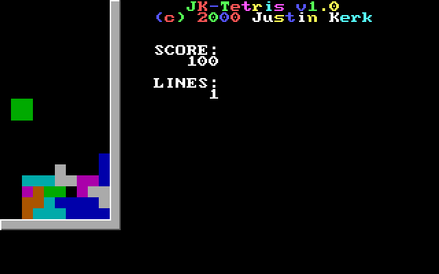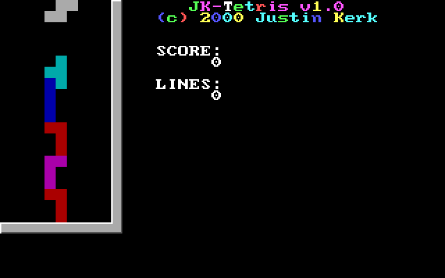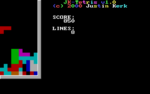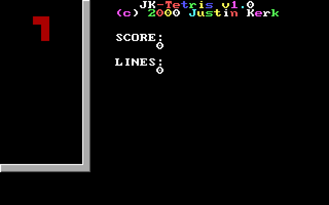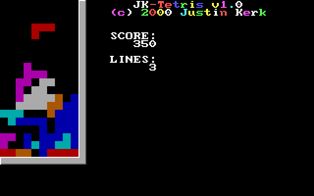 Предельно примитивный тетрис от Джастина Керка, который также отметился любительским квестом на движке AGI, названным в честь себя самого, - Justin Quest. Когда-нибудь это приключение обязательно найдёт своё место в коллекции нашего сайта, но а пока что предлагаем сыграть в эту его поделку, вероятно учебную.