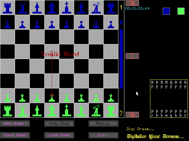 Управление осуществляется мышью: вначале тянем маршрут от фигуры к новой клетке, а затем жмём Ok или же C — для отмены хода. Графика выполнена в хорошо подобранной 16-цветовой палитре, однако при этом фигуры нарисованы весьма посредственно. Звуковое оформление представлено противным писком при ходах и примитивной мелодией при окончании партии. Возможны запись и загрузка позиций.
