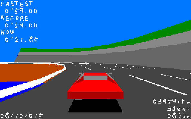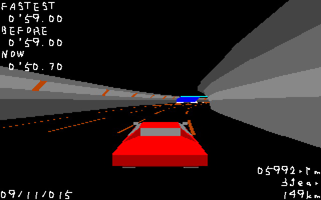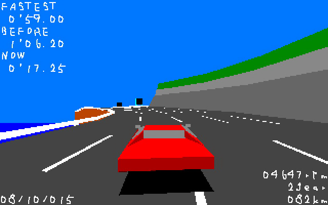 Rinji Position Ace 01, о которой и пойдёт речь, является компьютерной адаптацией гонок по круговым трассам. На этот раз, однако, соревновательный аспект делся непонятно куда, ведь была вырезана таблица рекордов вместе с возможностью туда записаться. Но зато теперь можно снова и снова наворачивать круги по двум трассам на одной и той же машинке без надежды на завершение. «Прогресс» налицо. Ваш покорный слуга, впрочем, накатал по 10 кругов по обеим трассам. Это ничего не изменило – гонки никак не хотели заканчиваться. Теперь рассмотрим то, что бросается в глаза. Первое, что можно заметить, – увеличенное разрешение рендеринга. Это приятно. Но потом взгляд цепляется за переделанный интерфейс... Неясно, почему разработчик перевёл практически всё в текстовый вид, да ещё и задал для надписей совершенно уродский шрифт, из-за чего часть цифр и букв с трудом читабельна. В верхнем левом углу выводятся лучшее время, время предыдущего и текущего кругов, справа внизу – скорость и показания тахометра. Управление осталось прежним.