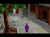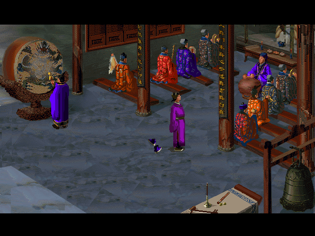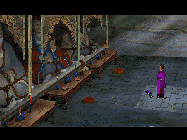 Управление предельно простое и реализовано в основном только мышью. Тут вообще даже нет игрового меню в нашем классическом понимании. Клавиша “Space” активирует инвентарий, в котором будут лежать собранные вашим протагонистом предметы. Правая кнопка мыши циклически переключает режимы: «говорить», «идти», «взять», «применить», – все они отображаются анимированными иконками. Ещё при наведении на сюжетно значимый объект интерьера на нём возникает пиктограммка «глаз», а внизу – мелкий текст на иероглифах, которые означают пояснения либо то, что ваш персонаж смог прочитать на поверхности предмета. Есть даже короткие анимационные вставки! Если вы берёте предмет, например лежащий на столе в храме, то это сопровождается небольшой по размерам кадра FMV-анимацией с отображением сего действия. Вот с такой нехитрой геймплейной механикой вам предстоит пройти всю игру…