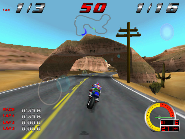 Именно спокойствие, связавшее фигурку гонщика в униформе, пестрящей размытыми рекламными интеграциями, и двухколёсного жеребца в не менее экстравагантном камуфляже, ненавязчиво сопровождает игрока везде и всегда. Оному не мешает ни таймер, беззвучно тикающий между чекпоинтами, ни головокружительные вылеты пилота из седла, число которых при отсутствии должной концентрации на высоких скоростях резко возрастает. Обогнать в RR действительно легко. Даже когда ты один из сотни гонщиков на карте Sierra Dorado. Непросто удержаться в собственном седле, когда на спидометре за триста, путь петляет, как морской узел, а вокруг — один сплошной отвлекающий манёвр. Всё, что можно увидеть от третьего лица или «глазами» гонщика, благодаря Glide2x буквально «дышит» своей собственной «жизнью» на любой из десяти представленных в игре трасс, доступ к которым, как и к мотоциклам, открывается по мере получения первого места на предыдущих.