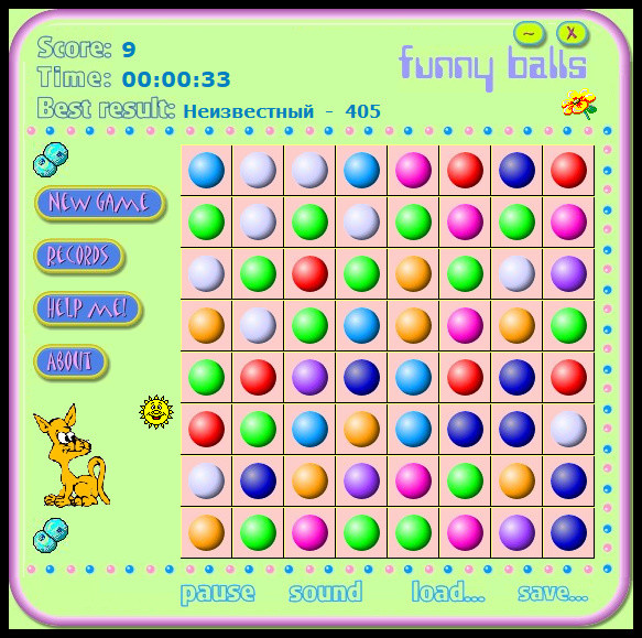 Одна из вариаций известной казуальной забавы "Шарики". Меняем местами разноцветные шарики на целиком заполненном поле так, чтобы собирались линии из трёх или больше, после чего все участники этой линии исчезают, находящиеся выше осыпаются, а освободившиеся клетки заполняются новыми шариками, и так пока не возникнет ситуация, в которой невозможно сделать такую перестановку.