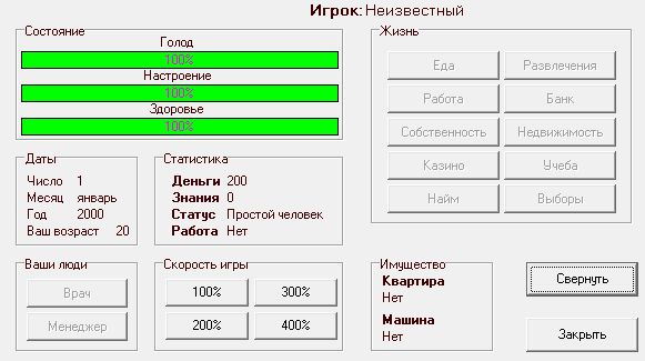 Несмотря на кажущуюся оригинальность, это банальный симулятор жизни и карьеры, состоящий из таблиц и интерфейса, без графики. Для успешного прохождения игроку придётся развиваться поступательно и при этом следить за текущим положением дел. Дни следуют за днями, снижая уровни сытости и настроения, которые необходимо повышать покупкой еды и развлечениями. Карьера начинается с должности дворника и мизерной зарплаты, но потом, повышая уровень знаний в разделе "учёба" (не бесплатно, конечно же), герой сможет занимать всё более и более престижные посты. Комната в общежитии сменится съёмной квартирой и далее по нарастающей; первая машина - "Запорожец" - эволюционирует в дорогущую иномарку. Наконец, на определённом этапе игры вы сможете позволить своему персонажу иметь вклады в банке, получать доходы от сдачи недвижимости в аренду и нанимать работников, которые выполняют разные полезные функции: охранник защитит от нападений во время развлечений, врач - вылечит внезапные болезни и тому подобное. Финальным аккордом будет подача заявки на выборы и последующее в них участие, которое станет успешным только при достижении определённых "высот" в разделах "знания" и "собственность". Всё это упаковано в стандартную оболочку - окно с различными показателями и шкалами и множество дополнительных окошек, открываемых по мере надобности. Каких-либо графических украшений не предусмотрено.