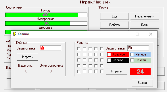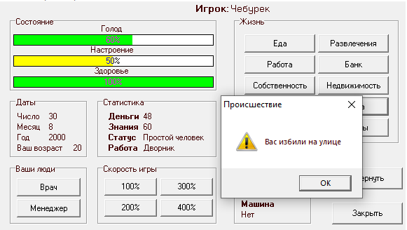P.S. Смерть персонажа от голода и депрессии для таких игр совершенно стандартна, но здесь герой умрёт и тогда, когда в его кошельке будет минус сто денежных единиц, - причина смерти при этом не разглашается...