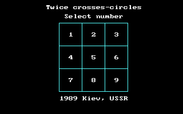 В игре нет даже заставки: сразу открывается единственный экран, содержащий название, данные о выходе программы и саму сетку 3х3. Человек всегда играет крестиком, компьютер - ноликом. В Twice crosses-circles реализован крайне странный алгоритм: бывают ситуации, когда даже если поддаваться компьютеру и оставлять ему выигрышный ход, то он поставит нолик на другую клетку, сводя партию к ничьей. Но это ещё не всё - если мы выстроили линию из трёх крестиков, то... партия продолжается! Причём компьютер её может даже после этого выиграть... Чтобы здесь победить, игроку нужно создать ситуацию, когда наш ход выстраивает линию из трёх крестиков и при этом заполняет последнюю клетку. Так и только так мы увидим заветную надпись "Player win!".