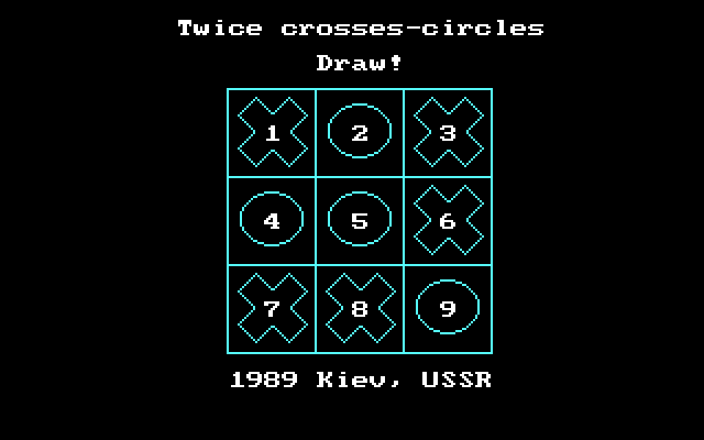 Игра имеет очень простую графику - просто чёрный фон, белые надписи и синие силуэты крестиков и ноликов. После завершения партии программа предлагает сыграть ещё раз или же выйти в DOS. Мы, пожалуй, выходим.