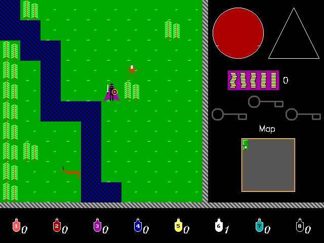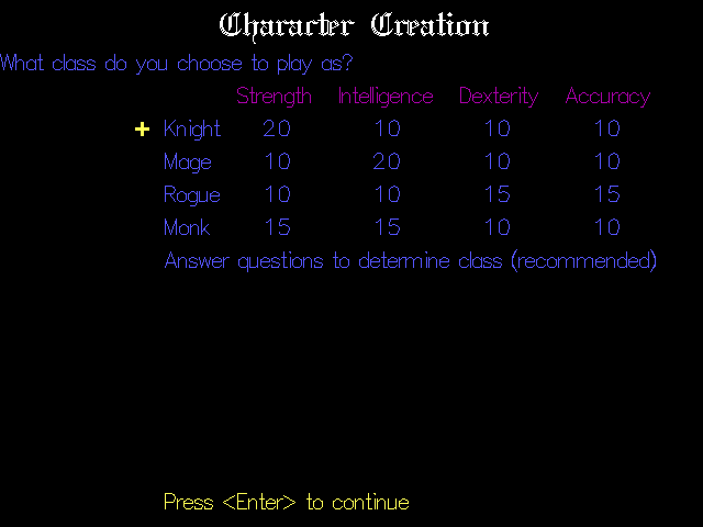 Предыстория неважна, а куда более интересно, что автор не поленился сделать свою ролевую систему с несколькими классами, навыками, бонусами и штрафами. Здесь даже есть классическая схема создания персонажа с опросником. Система довольно простая: четыре основных параметра и чуть больше второстепенных. Самым выгодным персонажем является маг, потому что он сразу получает три заклинания, дающие возможность атаковать на расстоянии, лечиться и телепортироваться. Другие классы будут получать доступ к магии гораздо медленнее, а без денег на зелья и с довольно высокими требованиями к повышению уровней их способность к выживанию гораздо ниже.