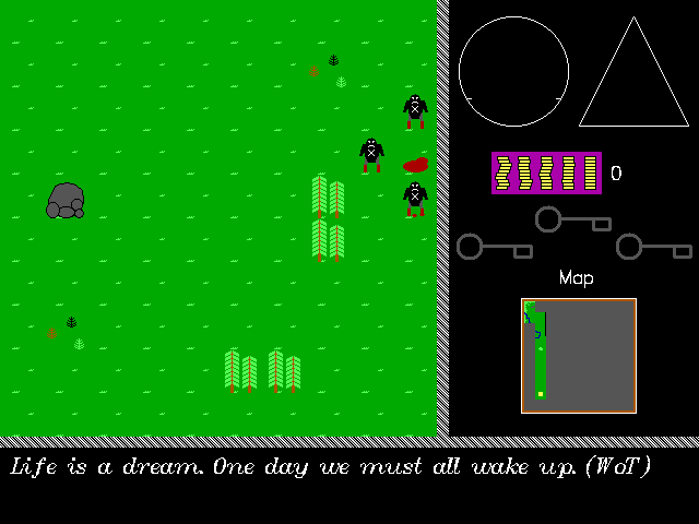 Это одна из тех игр, где мир поделён на экраны, перспектива сверху, всё сделано из тайлов, а боевая система подразумевает простое бодание с противником. В условно-бесплатном секторе таких проектов было немало. Можно вспомнить Dink Smallwood или игры попроще. Но здесь всё делал один человек. Поэтому графика крайне аскетичная с человечками из палочек и квадратно-гнездовым дизайном мира.