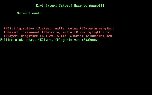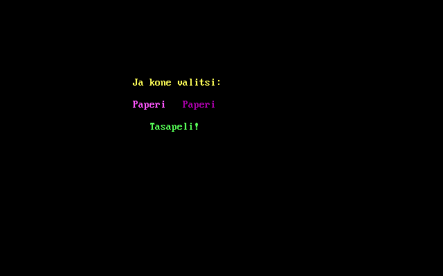 Графика как таковая отсутствует, - к счастью, для понимания сути происходящего достаточно уяснить смысл всего-то трёх слов финского языка. С другой стороны, игровой процесс (если его можно так назвать) длится от силы пару секунд. Состязаться предстоит исключительно с искусственным интеллектом. При запуске "Kivi Paperi Sakset" напоминает нам условия этого развлечения (камень затупляет ножницы, бумага обёртывает камень, ножницы разрезают бумагу) - и предлагает выбрать один из трёх вариантов своего "хода". Для этого следует нажать клавишу "К" (от "Kivi" - "камень"), "P" ("Paperi" - "бумага") или "S" ("Sakset" - "ножницы") - и спустя несколько мгновений увидеть на экране результат случайного ответа оппонента. Вместе с подобающими случаю поздравлениями ("Sinä voitit! Onnea!") - либо же сообщениями о горьком и досадном поражении ("Kone voitti! Hävisit!") или о ничьей ("Tasapeli!").