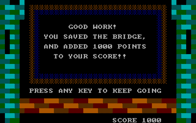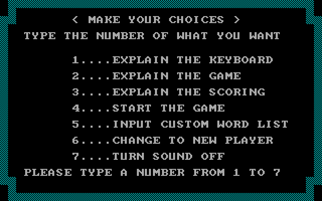 Из дополнительных пунктов главного меню стоит также упомянуть пятый, предназначенный для составления собственного списка слов, атакующих наш замок и подлежащих вводу с клавиатуры. В любом случае все враги, по десять за раунд, появятся на экране для предварительного знакомства накануне атаки. По завершении же раунда нам продемонстрируют набранное количество баллов - и предложат повысить уровень сложности для продолжения борьбы за замок. При желании можно вернуться в меню и активировать шестой по счёту пункт, отвечающий за смену игрока (иначе говоря, за обнуление показателя очков). В версии 2.1, выпущенной уже в 1989 году, в ассортимент доступных опций этого экрана добавилась ещё и седьмая позиция, позволяющая выключить звук (а также были исправлены некоторые ошибки и опечатки в текстах, что с учётом позиционирования игры как пособия по изучению правописания оказывается делом очень даже уместным).