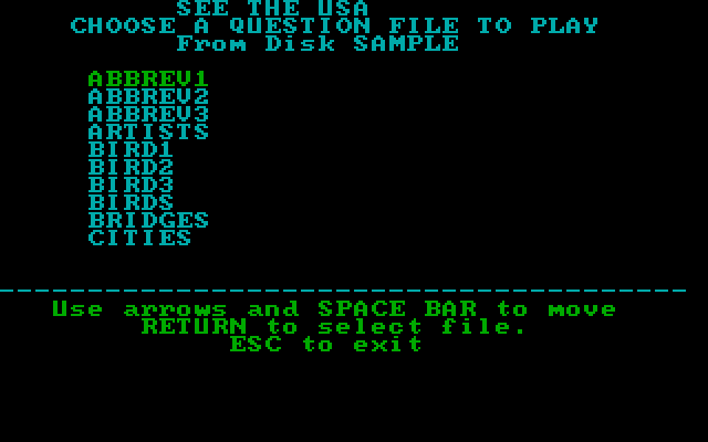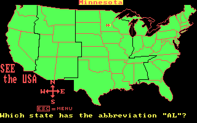 При этом «See the USA» была своего рода флагманом образовательного ПО производства Compu-Teach: первое издание игры для Apple II выходило на восьми (!) дискетах, которые в процессе прохождения приходилось постоянно менять, как диски в какой-нибудь позднейшей «Фантасмагории», – ну а в большой коробке поставлялись ещё и огромного размера карта США да настоящая настольная головоломка на сбор картинки из фигурных кусочков. К сожалению, судя по всему, к моменту появления PC-версии от такой бонусной роскоши пришлось уже отказаться. Более того, версия игры для DOS, единственный доступный на сегодня вариант которой датирован началом 1992 года, отличается поддержкой одного лишь адаптера CGA, выглядевшего анахронизмом уже на конец 1980-х, – это несколько противоречит обещанному в руководстве пользователя наличию в программе более сотни «красочных» иллюстраций. Соответственно, звуковые эффекты ограничиваются здесь одноголосными руладами PC Speaker’а... Впрочем, не исключено, что в природе существовала и более продвинутая версия данной игры: во всяком случае, незадолго до закрытия Compu-Teach объявила о выходе итерации уже под номером 3.0 – в исполнении для Windows 9х/2000 (это издание тоже пока что остаётся ненайденным).