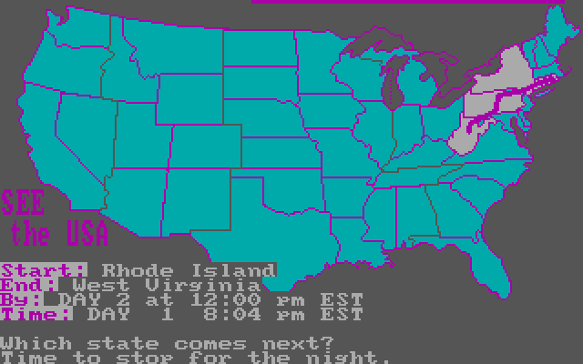 Путешествие наше сопровождается какой-никакой анимацией в лице появляющейся на карте красной линии и движения уже знакомой нам машинки, а также смены дня и ночи в положенное им время. Счастливчики, успешно добравшиеся до конечной точки своего путешествия, удостаиваются «приза» в лице одной из тех самых «красочных иллюстраций», призванных изображать собой ту или иную достопримечательность соответствующего штата. Увы, упоминавшаяся уже палитра CGA не позволяет в полной мере воздать должное пейзажам и культурным объектам Северной Америки.