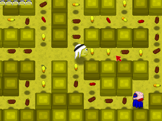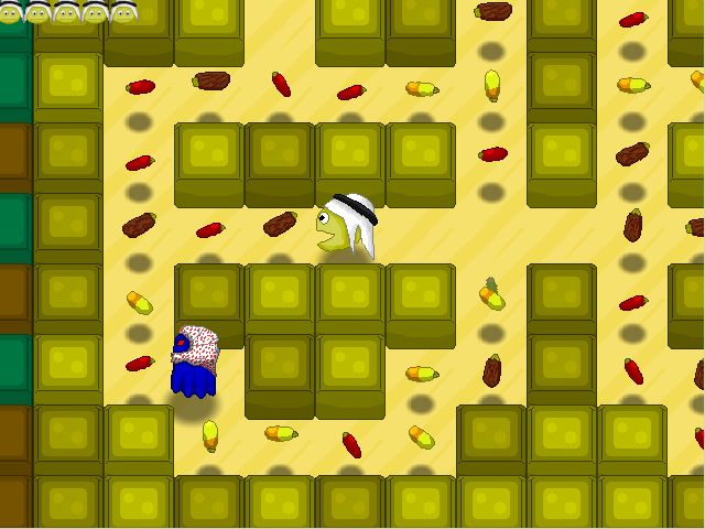 На этот раз наш пэкман носит на голове арабский белый национальный головной убор – куфию. Нужно ходить по лабиринтам улочек ближневосточного города и поедать вместо однообразных классических горошин «разнообразные» фрукты. Это три сорта фиников, отличающихся по форме и цвету. Пока не съедите всю эту плодоовощную продукцию, не перейдёте на следующий уровень. В роли «привидений» у нас тут выступают сомнительные личности в «арафатках», надетых поверх тёмных накидок, спадающих до пят, а в области лица оставлены только прорези для красновато-демонических глаз. На обывателей с городских окраин, которые любят задавать «классический» вопрос: «Э, сигаретки не найдётся?», они явно не похожи, и если максимально политкорректно постараться их идентифицировать, то может возникнуть желание предположить, что, возможно, они могут быть немного склонны к радикальным действиям. Однако по авторскому замыслу всё же чувствуется, что в таком «наряде» должны подразумеваться именно «привидения». Любой контакт с ними будет фатален. Кстати, их скорость специально задана чуть больше, чем у вашего колобка-«фруктоеда». Помимо фиников, по углам «ближневосточного» лабиринта расставлены миски, возможно с какой-то едой или водой. Это аналог маньякопилюль в оригинальной игре. Так вот, когда наш весёлый араб-пэкман «съедает» миску, то «привидения» почему-то становятся добропорядочными ближневосточными горожанами, одетыми в светлые национальные одежды и в течение некоторого времени благоразумно убегающими от нашего «пожирателя фиников». Если такого гражданина пэкман догонит и съест, то от бедняги останутся только перемещающиеся глáзки. По истечении времени действия «мисок» «глáзки» опять превращаются в радикально настроенных привидений…