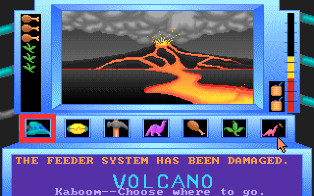 С точки зрения игрового процесса перед нами оказывается очередная разновидность забавы по поиску и распознаванию динозавров, знакомой посетителям сайта Old-Games.ru по таким уже представленным на нём достойным вещам, как «Return of the Dinosaurs» или «Zombie Dinos from Planet Zeltoid». К сожалению, сюжет – о мальчике Донни, которому необходимо срочно написать для школы реферат о динозаврах, – по какой-то причине остался в 1984 году: теперь нам предлагается всего лишь присоединиться к некоему не то инопланетянину, не то просто путешественнику во времени в его поисках динозавров при помощи темпорально-летательного аппарата под названием «Кабум». Большую часть экрана занимает панель управления этим последним: вверху по центру красуется вид из иллюминатора на текущую локацию, ниже расположены управляющие кнопки с пиктограммами, на правой кромке отображается индикатор запаса топлива, расходуемого на любые действия и никак не возобновляемого (шкала плюс две запасных канистры), а в аналогичном месте слева – похожий показатель имеющегося у нас провианта, т.е. корма для динозавров (в меню – два блюда: «мясо» и «трава»).