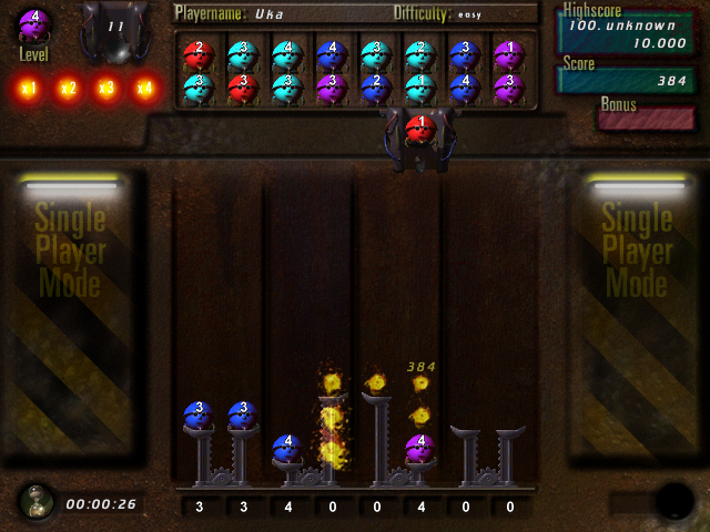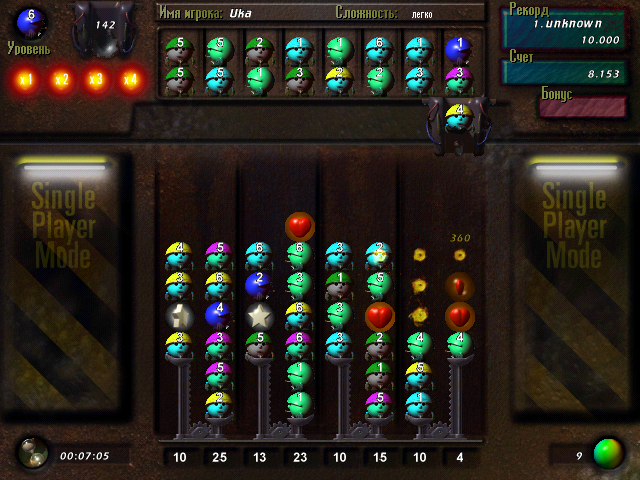 На основном экране игры вводим при желании своё имя напротив строки «Player 1» – и готовимся ломать себе голову. В левом нижнем углу ведётся отсчёт времени – не беспокойтесь: никакого таймера и никаких ограничений здесь нет, так что раздумывать над следующим ходом можно сколько угодно, ну а секундомер установлен исключительно в информационных целях. Более важный счётчик красуется справа вверху – это показатель набираемых нами очков вкупе с результатом текущего рекордсмена; собственно, основной целью игры как раз и оказывается получение как можно большего количества баллов. А начисляются таковые, как уже замечалось выше, за удаление с поля шариков – в первую очередь путём выстраивания их как минимум по три в ряд сообразно цвету, при этом каждая такая «тройка» забирает с собой и все объекты того же оттенка, с которыми она соприкасается по вертикали. Ещё одним, более редким сравнительно с «тремя в ряд», способом очищения колонок оказывается «пять в столбик»: если вам удастся расположить друг на друге именно такое количество шариков одного цвета, они сольются в один-единственный – того же оттенка, но зато сверхтяжёлый (равный по весу сумме всех своих составляющих).
