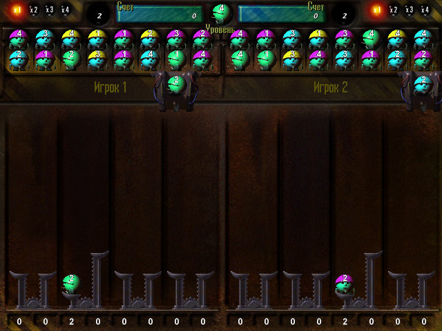 Осталось ещё упомянуть о многопользовательском режиме игры: состязаться дозволяется как с другом за одним ПК (методом «сплит-скрин» – с разделением экрана по горизонтали напополам: второй игрок использует по умолчанию клавиши «A», «D» и «S» или «пробел»), так и по сети (этот вариант вряд ли актуален по состоянию на сегодняшний день). При этом имеются и два «подрежима»: «Турнир» отличается от одиночного способа игры лишь тем, что шарики, выброшенные с «качелей» одного пользователя, оказываются на поле его соседа, – целью же является набрать большее количество очков, нежели соперник. А вот в варианте «Аркада» необходимо уже целенаправленно вывести второго участника из игры: все подбрасываемые ему шарики тут превращаются в камни, привычные «бонусы» перестают появляться в «запасе» – и их нужно зарабатывать самостоятельно (например, «джокер» выпадает после третьей собранной «тройки», «бомба» – после пятой и т.д.), ну а добрый десяток «необычных» предметов и вовсе задействован только в этом режиме.