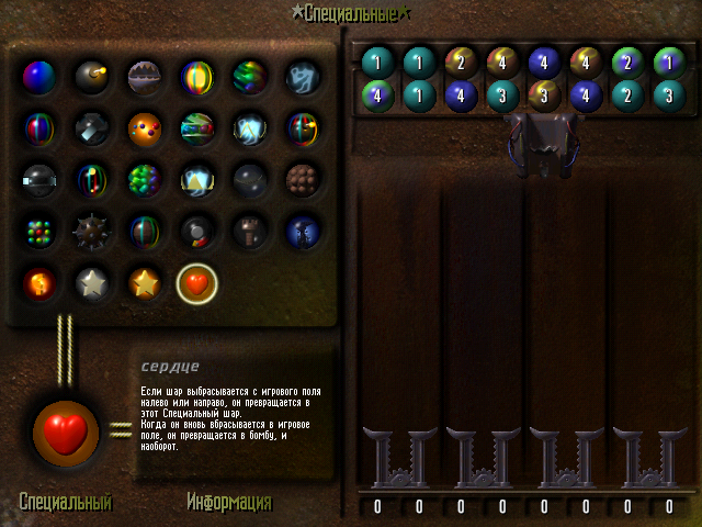 После достижения нами шестого уровня на «скамье запасных» может появиться один из первых полезных бонусов – «джокер»: шарик, переливающийся сразу всеми цветами и способный замещать любой из них в качестве элемента «тройки». Кстати говоря, при доступности какого-то из таких приятных сюрпризов в правом нижнем углу появляется его изображение – вместе с индикатором количества шариков, которое осталось вывести на поле до его активации. Начиная с восьмого уровня можно заполучить себе в актив и бомбу – ту самую, в которую умеют превращаться «сердечки». А достигшим десятого уровня иногда удаётся встретиться с «резаком», способным уничтожить целую колонку шариков, включая и те «отрицательные бонусы», которые иным образом с экрана не удалишь. К последним относится, например, «камень», не входящий ни в какую «тройку» и только зря занимающий на экране драгоценное место.