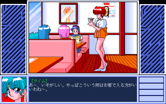 Практически всё из того, что мы рассказывали о предыдущих трёх частях, применимо и здесь. Juwel Bem Hanter Lime 4 – простейшая в своём исполнении визуальная новелла с адвенчурными элементами, где мы выбираем то или иное действие, как правило до тех пор, пока отклик на него не будет повторяться снова и снова, чтобы потом попробовать другой вариант. Какой-либо нелинейности опять-таки нет. Ожидаемо. Графика выполнена на всё том же приличном уровне, в этот раз авторы добавили анимаций даже больше обычного. Хорошо это или плохо, но музыка осталась той же самой. В плане управления и интерфейса изменений или нововведений нет. Сцен для взрослых не добавили. В очередной раз. А мы и не против. Если сравнивать с «третьей серией», то пошлятины определённо стало меньше. На этот раз авторы попытались апеллировать к той части аудитории, которая любит официанток и их униформу.