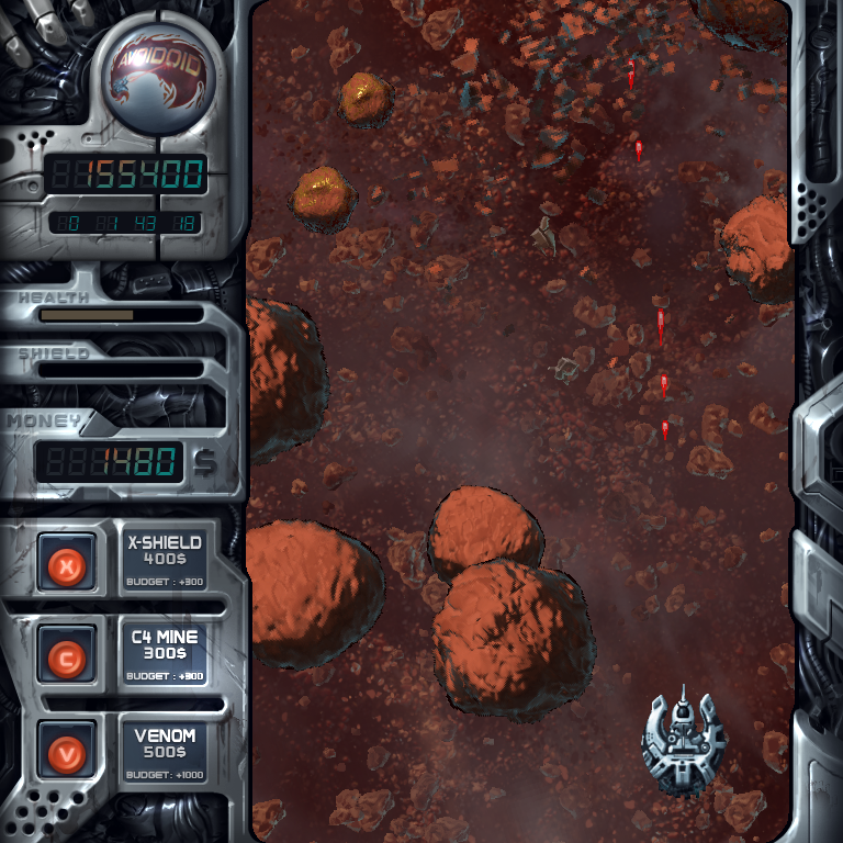 Зато есть три разновидности дополнительных высокотехнологичных средств противодействия потоку астероидов. Первое – “X-Shield” (клавиша “X”) – активированное голубое свечение вокруг космолёта гарантированно защищает корпус машины от повреждений, но с каждым ударом сам этот силовой щит неизбежно деградирует. Его однократное применение стоит 400 космодолларов. Хватает его примерно на 5 столкновений. Второе – “C4 Mine” (клавиша “C”) – вы разом выпускаете навстречу потоку астероидов несколько маленьких мин, которые от касания о глыбы разносят их вдребезги. Стоит это «удовольствие» 300 космодолларов. И наконец, “Venom” (клавиша “V”) – мощное волновое возмущение пространственно-временнóго континуума разносит «в пыль» все глыбы в радиусе примерно на пол-экрана. Эта, безусловно, мощная «фича» стоит уже 1000 космодолларов.
