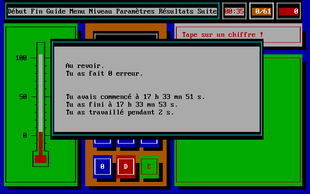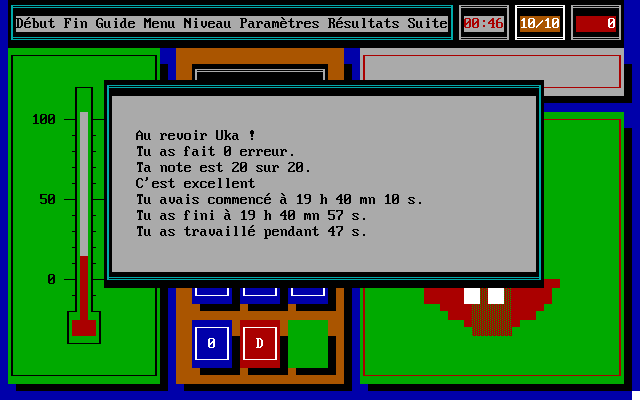 Справа вверху отображаются время, оставшееся нам на размышления, счётчик выполненных заданий и общего количества таковых, а также число допущенных игроком ошибок. Регулировать все эти и прочие настройки можно при помощи разделов меню в той же верхней строке, вызываемых либо щелчками мыши, либо нажатием функциональных клавиш. Так, «Début» и «Fin» перезапустят или прекратят нашу серию упражнений; «Guide» выведет справку по любому из элементов интерфейса; «Menu» и «Niveau» позволят сменить выбранные ранее арифметическое действие и уровень сложности соответственно; ну а «Résultats» выдаст статистику нашей успеваемости. Самое же полезное скрывается, пожалуй, в «Paramètres»: здесь получится активировать почему-то выключенный по умолчанию звук, сменить палитру, отрегулировать упомянутые выше показатели и др.