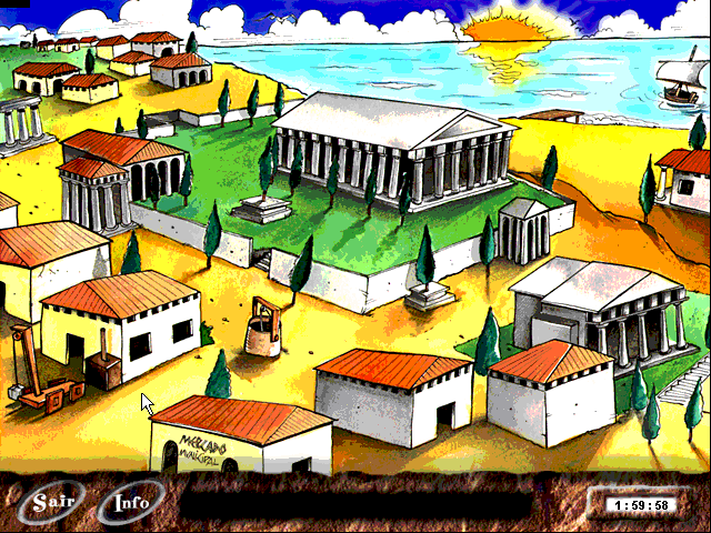 Как уже говорилось, основной экран демонстрирует вид на приморский античный полис в перспективе «с высоты птичьего полёта»; различные здания при щелчке по ним активируют ту или иную из мини-игр. В левом нижнем углу красуются две кнопки – для выхода в систему и для повторного вызова уже виденной нами при запуске краткой справки (о самом Архимеде и о здешних развлечениях в целом); в аналогичном же месте справа можно видеть безжалостно тикающий таймер: на то, чтобы успешно завершить все испытания, нам отводится ровно два часа реального времени.