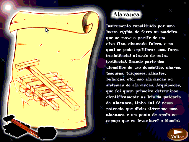 Для начала игры в «спряжения» следует дёрнуть за большой красный рычаг справа вверху: расположенная поблизости табличка популярно поясняет, что за пять монеток можно попытать свои силы сразу в трёх упражнениях подряд. На своего рода античных подобиях мониторов по центру экрана при этом отображается некоторый глагол, а ниже – те наклонение, время и число, в которые его необходимо перевести, вводя свой ответ вручную. Например, «refincar», «Condicional», «Presente» и «2a. Pessoa do Singular» намекают на то, что на выходе должно получиться «refincarias» (к счастью, диакритика здесь и далее при наборе букв не учитывается). Если решение оказалось верным, то слева внизу можно будет видеть, как гиря при помощи полиспаста немного поднимается вверх, – для победы необходимо обеспечить полный её подъём (иными словами – выиграть три раза подряд; понятное дело, в других мини-играх представлены иные архимедовы механизмы). В случае ошибки описанное устройство даст задний ход, а нам продемонстрируют правильный вариант (денег, естественно, при этом не вернут и очков не начислят).