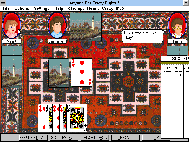 Доступные разновидности карточных игр перечислены на основном экране в качестве главного меню: криббедж, джин, червы, пики, 31, 99, вист, пиночо, джордж, охел, юкер и сумасшедшие восьмёрки. Как легко заметить, многие из этих развлечений в наших краях особой известностью похвастаться не могут, – однако же пояснять в описании их правила было бы совсем не к месту, благо все они достаточно подробно расписаны в упоминавшемся уже разделе «Help» верхнего меню. Добавим только, что после предпочтения одной из карточных игр представится и возможность отобрать себе партнёров – одного, троих или пятерых в зависимости от дисциплины. Каждый из восемнадцати обитателей и гостей особняка – а среди них имеются и дети, и даже один робот! – обладает более-менее ярко выраженной личностью, биографией (доступной к ознакомлению на этом же экране начала партии), а также «сильными» и «слабыми» сторонами в лице склонности к определённого вида развлечениям из представленной дюжины вариантов. Впрочем, всегда можно довольствоваться и автоматическим выбором соперников, дабы без промедления приступить к собственно игре.