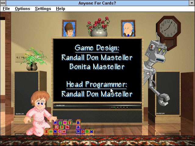 Талантливейший американский программист Рэндалл Дон Мастеллер хорошо известен любителям старых игр как соавтор и портировщик немалого числа шедевров от таких компаний, как Screenplay, Mastertronic и Microprose, включая, к примеру, «Pirates!» и «Barbarian». Однако в 1994 году, отказавшись от работы по контракту на другие конторы, он решил перейти полностью на вольные хлеба. Судя по всему, «Anyone for Cards?» стала первым самостоятельным проектом его студии Random Programming (вскоре переименованной в Random Games) – и проектом вполне себе семейным: продюсером выступила Бонита Мастеллер, а за музыкальное оформление и звуковые эффекты отвечал Курт Мастеллер.