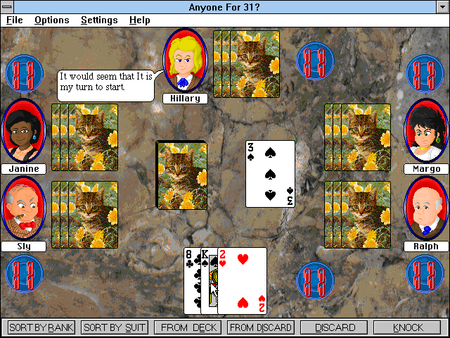 Управление реализовано посредством мыши; интерфейс соответствует привычным стандартам Windows. При помощи раздела «File» верхней строки можно сохранить и загрузить свой прогресс, выйти в систему, а также вернуться в главное меню из любого состязания, тем самым немедленно его прекратив (ту же функцию выполняет сочетание клавиш Ctrl-R). «Help» ожидаемо выводит внутриигровую справку, тогда как «Options» и «Settings» отвечают за настройки – соответственно игры в целом и каждого из двенадцати её режимов в частности. К первой группе относятся регулировка скорости анимации, в том числе вывода многочисленных текстовых реплик и комментариев участников, включение и выключение звука, выбор MIDI-мелодии (Курт Мастеллер организовал семь аранжировок на любой вкус, – хотя, скажем, «Менуэт» был явно одолжен из собрания Voyetra), выбор общего уровня мастерства всех соперников, а также смена узора скатерти на столе и «рубашки» у карт (в ассортименте – соответственно 12 и 8 вариантов их внешнего вида). Что до настроек класса «Settings», то они ожидаемо уникальны для каждой из дюжины здешних забав.