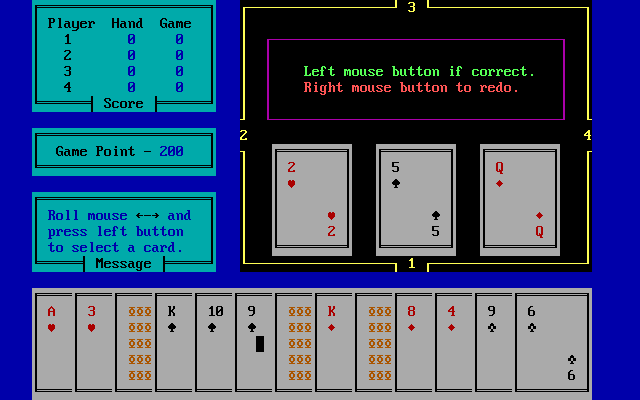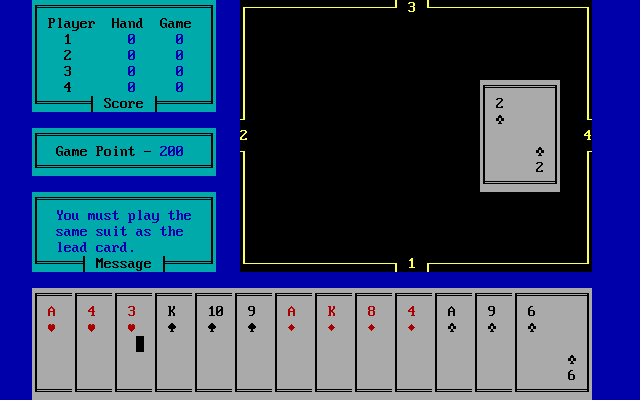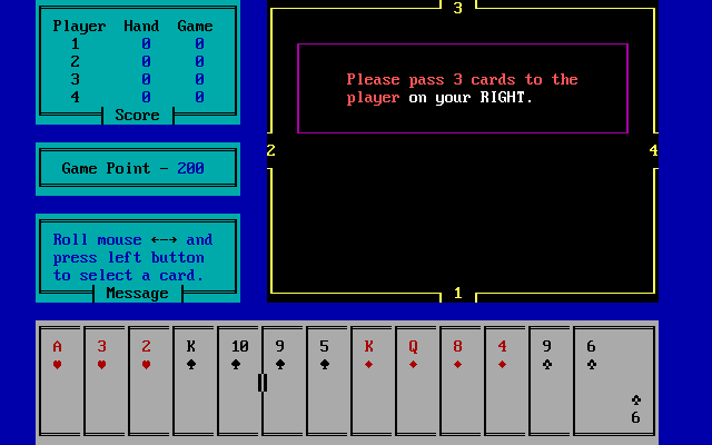 В игре, название которой происходит от соответствующей масти, участвуют одна стандартная колода из пятидесяти двух карт и четверо игроков, роли трёх из которых здесь отданы искусственному интеллекту. Правила в целом идентичны и были ранее детально описаны применительно к размещённой на сайте одноимённой другой игре, Hearts (1993, DOS), поэтому отдельно на них останавливаться не будем, а вместо этого далее разберём местный расклад на примере одной руки, а также краткой сводки по последующим трём из одной отдельно взятой игры. Единственная ощутимая разница же заключается в том, что в местной разновидности счёт идёт не до 100, как предусмотрено в классической версии данной забавы, а до 200 очков (по умолчанию) или же того числа, что задаст игрок, в диапазоне от 50 до 200 очков. В остальном же точно так же выигрывает тот, кто набрал наименьшую сумму к моменту достижения указанного лимита. Переходим к игре.