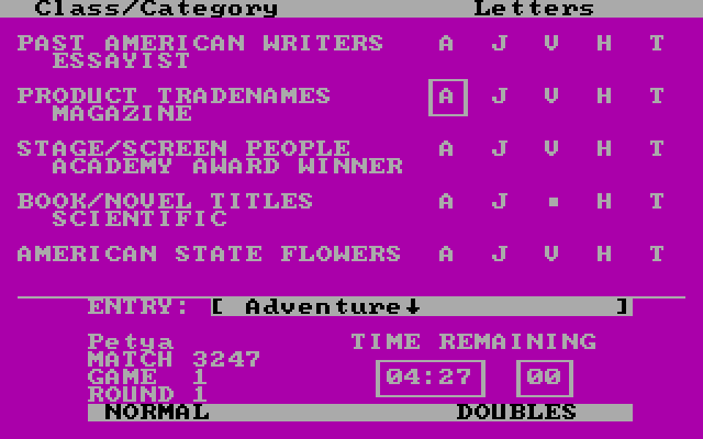 Викторина в стиле множества телеигр на эту тему, где есть разные категории вопросов, подсчёт очков за правильные ответы, а в быстроте ума и эрудиции соревнуются несколько участников. Но это перенос уже готовой настольной игры в компьютерный формат. В Computer Facts in Five можно выбирать темы наподобие: изобретатели, известные ныне живущие люди, литература и так далее. Но суть сводится к тому, что к каждому вопросу прилагается комплект букв, на которые начинаются правильные ответы. Их надо изложить в поле снизу, догадавшись, что именно там зашифровано, и подставить недостающие литеры. То есть полноценных вопросов, как в «Своей Игре» (ориг. Jeopardy), здесь нет. Непонятно, экономили ли авторы место на диске или жалели свои силы, но нельзя не отметить высокий уровень кастомизации игр. Не самая интересная «викторина», даже невзирая на столь ранний год выпуска.