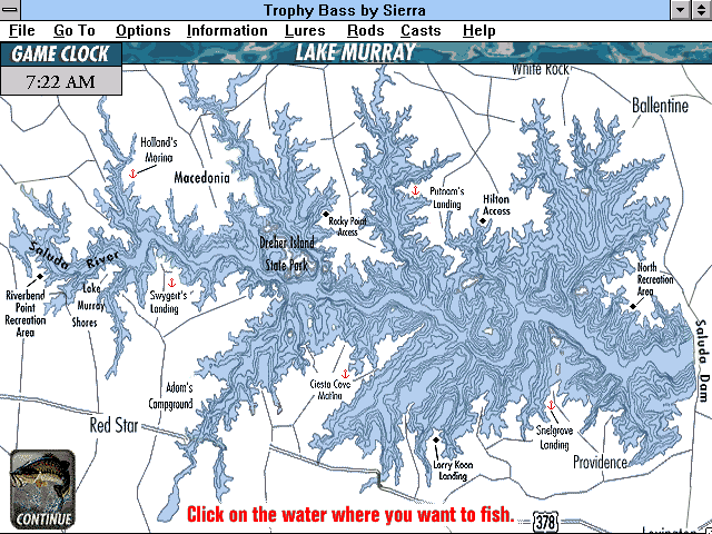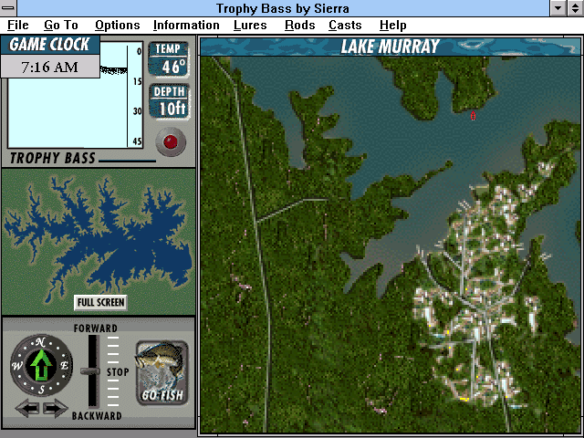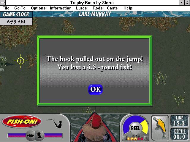 Симулятор рыбалки от Dynamix. Слово "bass" означает "окунь", и подразумевается, что вы хотите получить трофей в стиле поющей рыбы из магазина на диване. Процесс рыбалки выглядит не очень интересно — рыбак находится снизу экрана, а всё, что выше, занято водной гладью. Он закидывает удочку или сети, ждёт, пока крючок с манком опустится на нужную глубину, и... ждёт клёва. Но этим игра не ограничивается: вы можете выбирать себе орудия из арсенала спиннингов и разных приманок, предназначенных для разных рыб и разных условий ловли. По водоёму возможно перемещаться, изучая показания сигнала эхолота, который подскажет рельеф дна и наличие под вами рыбы. А далее остаётся изучать встроенную энциклопедию и прислушиваться к советам бывалых в аудиоформе. Или найти занятие поинтереснее.