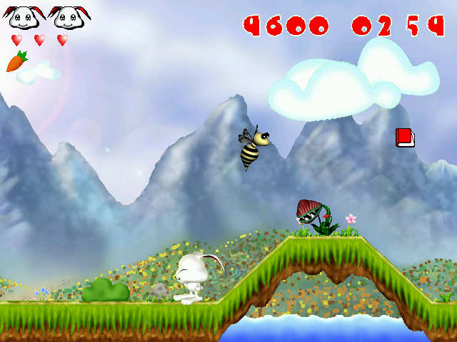 Бонусы делятся на четыре категории. Различные продукты питания (за одним исключением) и бытовые предметы нужны только для увеличения счёта. Морковки - то самое исключение - являются боеприпасами для альтернативной атаки: по нажатию "A" персонаж бросает их во врагов. Запас данных бонусов отображается в левой части экрана под шкалой здоровья; каждая морковка - один заряд. Бутылочки с зельями разных цветов (красные, жёлтые, синие, фиолетовые) восполняют здоровье, а также, что важно, увеличивают количество сердечек в случае отсутствия у нас повреждений: каждый такой бонус даёт дополнительное очко здоровья. Наконец, самыми важными являются круги, содержащие одну, две или три звёздочки: они дают временную защиту от различных вредных воздействий (в том числе от любых атак врагов), а кролик в такие моменты окружён словно бы вращающейся сферой. При наличии данных бонусов ниже запаса морковок появляется соответствующая шкала, обозначающая количество имеющихся у нас звёздочек, причём, что приятно, каждая такая в отдельных случаях может защитить не от одного вражеского удара, как должна, а от чуть большего количества. Вместе с тем, к сожалению, то ли из-за бага, то ли из-за странной задумки разработчиков бонусы из данной категории далеко не всегда работают корректно: может создаться впечатление, что имеется некая очень сложная система взаимодействия их типов (различающихся количеством звёздочек) друг с другом, но, похоже, это вовсе не так, а всё происходит случайным образом (хотя какие-то закономерности, может быть, и есть). Одним словом, любой такой бонус может как дать тот эффект, который должен, то есть снабдить нас одной, двумя или тремя звёздочками, так и не увеличить их количество вовсе либо же прибавить меньше защиты, чем ожидается. Кроме того, более-менее точно установлено, что максимальный лимит имеющихся у персонажа звёздочек, скорее всего, не может превышать пяти штук (то есть если у нас уже есть три таковых, то в случае взятия круга с тремя звёздочками мы получим в лучшем случае две, а то и нисколько). После гибели персонаж всегда возрождается в начале уровня без сохранения достижений (кроме счёта, отображаемого в правом верхнем углу), и то же самое, к сожалению, верно в отношении перехода на следующий этап: на него мы, как бы ни закончили предыдущий, всегда переходим с тремя сердечками и без каких-либо бонусов, фиксируются лишь набранный счёт и количество оставшихся "жизней".