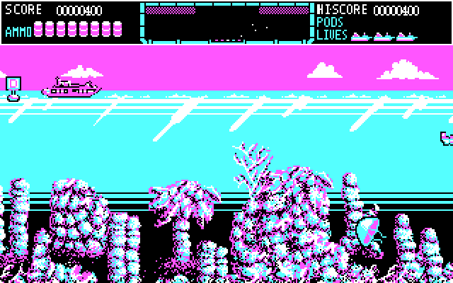 Но, как ни удивительно, у противников в данной игре есть искусственный интеллект: так, спустя сколько-то десятков секунд после занятия нами вышеозначенного положения лодки, идущие справа налево, начнут сразу же после своего появления запускать мины, которые смогут нас достать. Кроме того, медузы обычно выпускают ракеты под конец своего пребывания на экране, но подчас это зависит от нашего местоположения на нём. Наконец, враги не так уж редко словно бы координируют свои действия, загоняя нас в ловушку, когда корабль находится в центре экрана: медуза, проплывая под ним, выпускает ракету, от которой мы пытаемся уйти, а лодки справа выбрасывают мины, причём делают это на несколько мгновений раньше атаки медузы, из-за чего к моменту нашего подхода к этому участку они уже приближаются к поверхности и не могут быть уничтожены бомбами. Дополнительным усложняющим фактором является отсутствие (в отличие, например, от Amiga-версии игры) на буйках литер, поясняющих, какой бонус они содержат, - это становится известно только по достижении ими поверхности воды и после превращения во флажки с соответствующими буквами, тогда как технически брать буйки можно и до непосредственного их всплытия (и в ряде случаев из-за высокого темпа происходящего формально остаётся поступать только так).