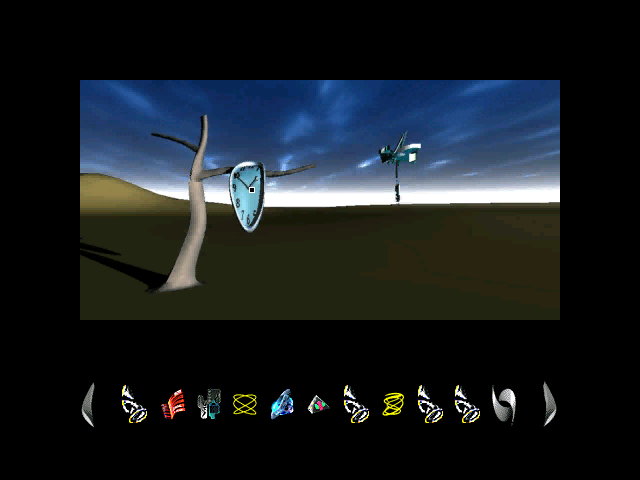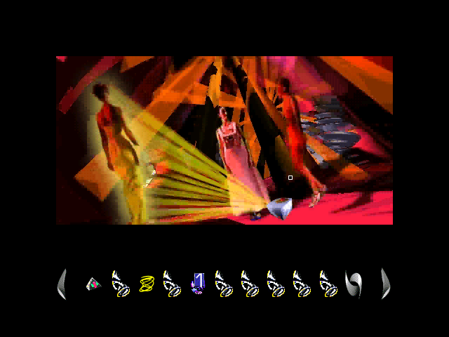 По части графики игра выполнена просто изумительно. Virtual NightClub демонстрирует абсолютную красоту CGI-видео и пререндеренных фонов, передающих киберпространство во всём блеске. Виду из глаз открываются картины и эффекты, достойные самой изысканной научной фантастики. Сложно с чем-то сравнить великолепие искривлённых ландшафтов пестрящей красками виртуальной реальности, запечатлённой в этой игре. Некоторые пространства, в которые попадает наш герой, никак нельзя заключить в привычные параметры: высота, ширина и длина. Настолько они сумасшедшие. В здоровую нормальную голову такие концепции точно не придут. Я лично улавливаю взаимосвязь окружающего мира с проигрываемой музыкой и её влиянием на мозг слушателя. Эти образы, весьма вероятно, создавались после поглощения экстази где-то на рейв-вечеринках в пригородах Лондона и Манчестера у тусовщиков, совсем потерявших связь с привычным миром, пока они танцевали в состоянии транса. Нечто подобное, возможно, рисуется и в умах диджеев и композиторов вроде Лиама Хоулетта (Prodigy), когда они "крутили" свои безбашенные треки в начале 1990-х. Визуализация музыкального контента в Virtual NightClub передана полностью. В этом плане надо отдать игре должное. Если эксперимент состоял именно в такой подаче для пользователя, то он удался. К тому же непрерывно будут радовать очень плавные анимации при переходах с экрана на экран. Почти на каждом из них что-то да происходит. Редко когда персонажи стоят как вкопанные и не двигаются под музыку. Все их движения естественные, не обрывочные и аккуратно наложенные как на видео, так и поверх лишь отчасти статичных слайдов. Согласитесь, что в игре схожего типа, если точные аналоги вообще есть, динамичность картинки обязательна. Я бы не смог представить спокойствие и безмятежность, которую мы видим в подавляющем большинстве квестов от первого лица, в Virtual NightClub. Поразительна также искусность интеграции оцифрованных движущихся моделей в компьютерной графике. Они выглядят так, как будто те и правда находятся в киберпространстве. И я имею в виду не кат-сцены, тоже заслуживающие отдельной похвалы за оригинальные образы и костюмы актёров, а непосредственно игровой режим. Нет такого, чтобы изображение персонажа выглядело плоским, как в Tex Murphy 94-96 годов. Иной раз видишь, как какой-то фрик, совершая головокружительные прыжки своего танца, приближается к тебе, пока ты вытаскиваешь что-то из инвентаря. Выглядит очень здорово.