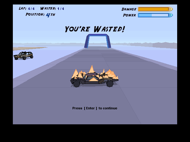 Это предельно простая по своей механике гонка на автомобилях совершенно разных моделей: от скромной городской малолитражки до внедорожника или даже мощного грузовика. В начале игры можно задействовать только одну из нескольких машин, но с прохождением уровней постепенно все остальные авто будут становиться доступными для выбора. Согласно правилам, для выигрыша вам необходимо либо прийти к финишу первым, проехав 4 круга, либо вывести из строя (waste car) все машины соперников (в заезде всегда участвуют 4 машины). На разных трассах выгодно применять какую-то одну тактику из этих двух вариантов.