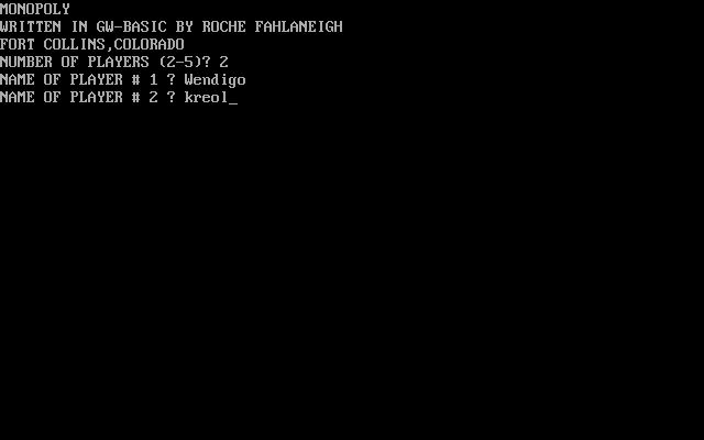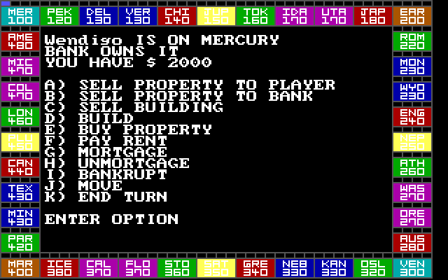 Перед нами оказалась очередная наследница «Игры землевладельцев» Элизабет «Лиззи» Мэги, изобретённой ею аж в 1903 году. Причём с любопытными нововведениями, хотя и не слишком удобная в эксплуатации. Возможна игра для компании от двух до пяти игроков, однако, к великому сожалению, ИИ не предусмотрен. Вначале настраиваем параметры игры, влияние случайности и разброс значений. Затем по очереди перемещаемся по полю и осуществляем коммерческие сделки, причём некоторые действия возможны только до перемещения по полю, например строительство, а другие, к которым относится покупка, можно делать и после. В игровом процессе не хватает автоматики: например, после попадания на чужое поле рента сама по себе не снимается — и приходится жать соответствующую кнопку, причём только заглавную (поможет включённый Caps Lock):