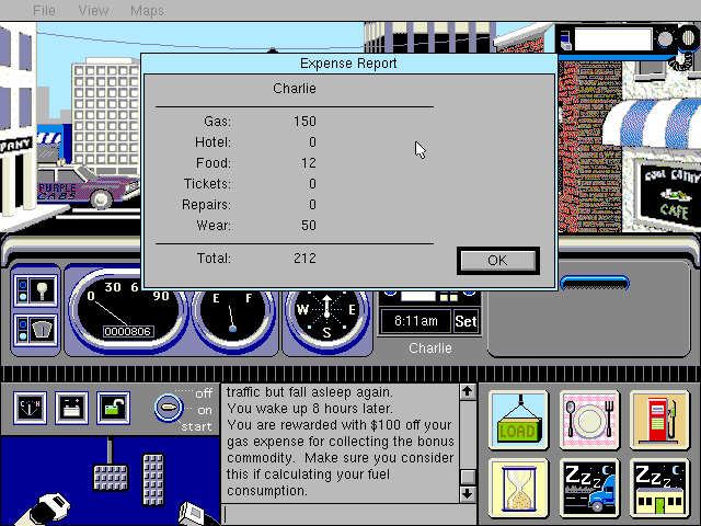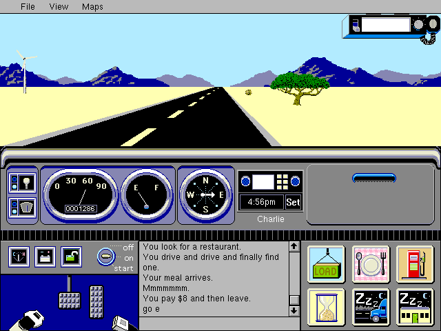 Ибо прямо по центру в нижней части экрана расположена панель для текстовых сообщений со строкой парсера под ней: именно здесь можно вводить и видеть команды уровня «start truck», которые временами оказываются куда более простыми и удобными, нежели целый ряд последовательных щелчков левой кнопкой мыши по разнообразным педалям и переключателям. Ну а справа внизу отображаются шесть кнопок-миниатюр для совершения прочих необходимых водителю грузовика действий. Так, «Load» отвечает за погрузку товара, – однако при этом придётся всегда вручную прописывать наименование такового! И разумеется, для успешного совершения данной операции необходимо ещё и находиться в том городе, где данный ресурс производится, – причём в рабочее время (склады открыты с 6 утра до 10 вечера). Дождаться этого самого утра и прокрутить время на один час вперёд можно при желании простым щелчком по кнопке с песочными часами, – а вот изображение тарелки в компании с вилкой и ложкой отвечает за более приятное и полезное для здоровья времяпрепровождение в ресторане (только при нахождении в городе, причём часы работы заведений общепита совпадают с упомянутыми выше; не забывайте отслеживать состояния голода и усталости протагониста в меню «View»). Кстати сказать, на дворе не то конец 1980-х, не то начало 1990-х, так что цены вполне приемлемые – по 8–12 долл. за трапезу.