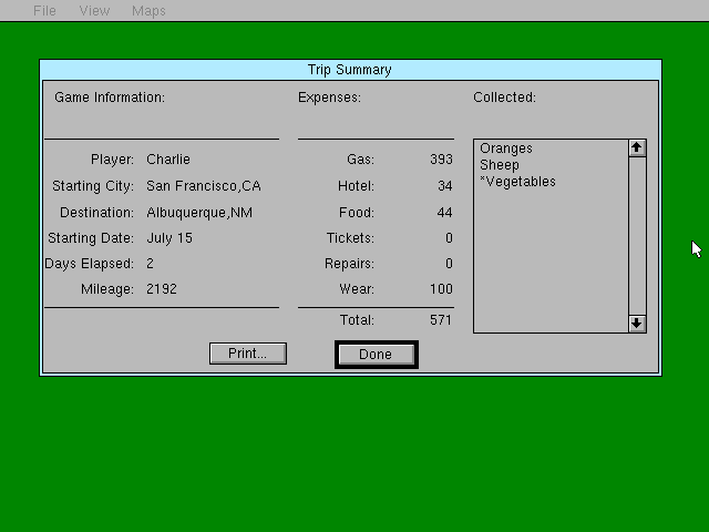 В любом случае первым делом рекомендуется загрузить именно простой обучающий сценарий – SAMPLE.SCN: он находится в самом низу доступного перечня, который в «домашней» версии открывается по умолчанию сразу после запуска, а в «школьной» – щелчком по пункту «Open Game/Scenario» на появившемся экране настроек новой игры. Здесь нам даже не потребуется вводить своё имя: в роли некоего Чарли мы должны, стартовав 15 июля из Сан-Франциско, доставить в Альбукерке пару-тройку наименований товаров, первым из которых являются апельсины. Всего, кстати сказать, в игре насчитываются 180 городов (сорока восьми континентальных штатов, – доехать на грузовике до Аляски или Гавайев, к сожалению, не получится в силу объективных причин) и 52 разновидности товаров, каждый из которых производится в одном или нескольких определённых городах, до четырёх включительно (например, удобрения – только в Тампе, а автомобили – сразу в Детройте, Индианаполисе, Цинциннати и Толедо). К сожалению, подробная и красочная карта США из комплекта игры с обозначением всех задействованных населённых пунктов и связывающих их дорог в настоящее время недоступна, а вот к текстовому перечню первых, а равно и соответствующих им товаров, который приводится примерно в середине руководства пользователя, обращаться придётся регулярно. В «школьном» издании всё это дозволяется ещё и редактировать на свой страх и вкус, при желании перераспределяя производство между городами (и даже добавляя собственные новые товары, до восьми включительно), – отдельной комплектной программой USAEDIT.