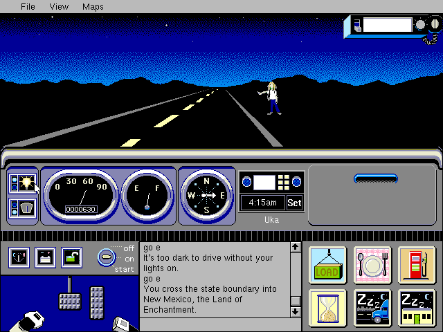 Для здорового сна предусмотрены сразу две кнопки: отдохнуть можно как прямо в кабине (что официально рекомендуется делать только летом, – зимой при этом потребуется оставлять мотор включённым, бездумно расходуя тем самым драгоценные литры бензина!), так и в мотеле (25–35 долл. за ночь). Ну и последняя миниатюра, с изображением бензоколонки, ожидаемо позволяет заправить бак нашего грузовика топливом (с ручным набором с клавиатуры желаемого количества такового). Вместимость у него 250 галлонов, причём каждая такая единица объёма (примерно 3,7 л) в любом случае обойдётся в один доллар, – а вот темпы его расходования зависят от рельефа местности и скорости нашего передвижения (которую, если мы вдруг зачем-то торопимся, можно увеличить командой «Speed NW» вместо «Go...» или «Drive...»). А если не отследить вовремя уровень заполнения бака бензином, то потребуется где-нибудь прямо на большой дороге вызывать эвакуатор при помощи переговорного устройства в правом верхнем углу – с оплатой по двойному тарифу.
